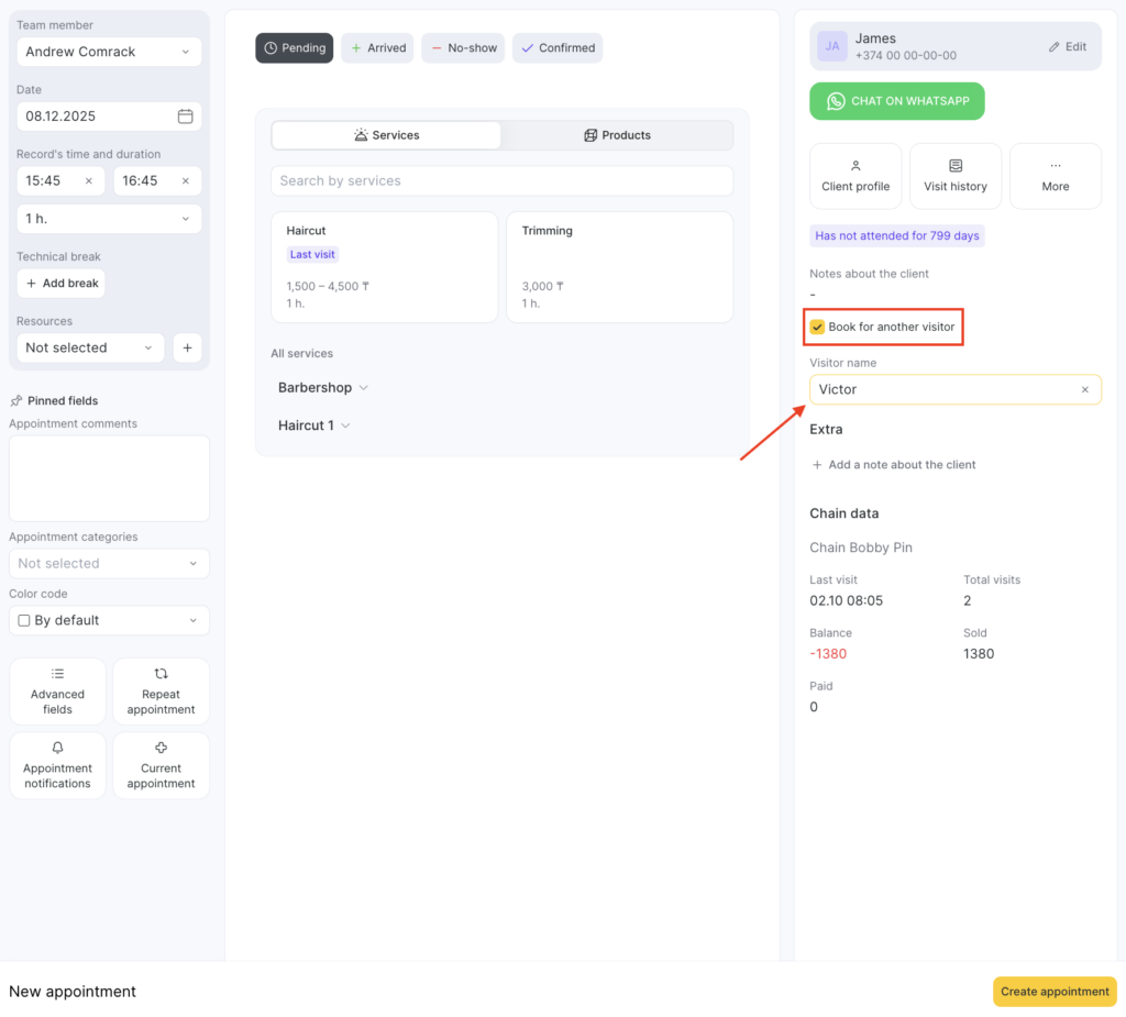 To remove a visitor from the visit, uncheck the “Booking for another visitor” field in the visit. The visitor will not be removed from the client’s card.