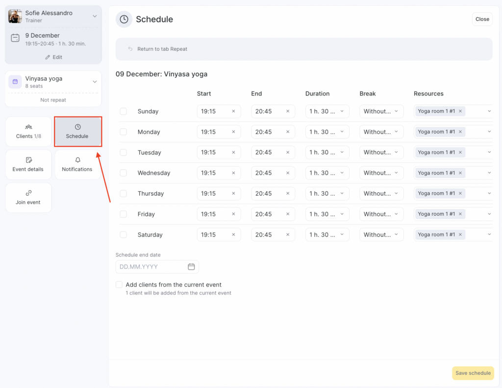- Finally, if you have added clients to the event, you can check the “Add clients from the current event” option to include them in the schedule as needed.