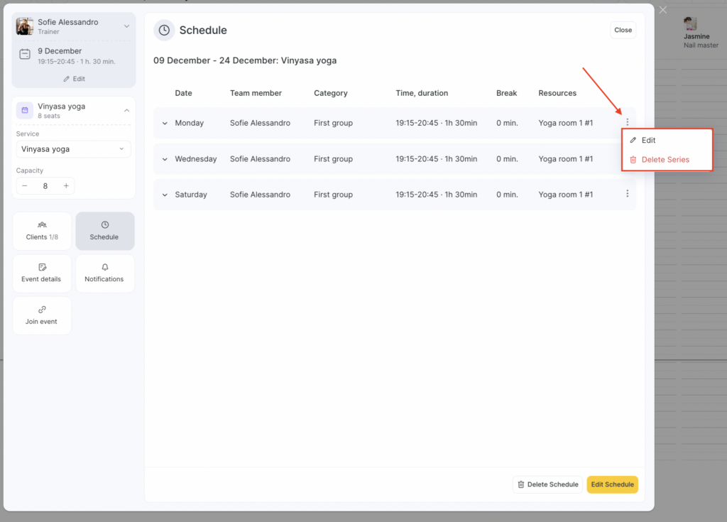Using the Schedule functionality, administrators can easily make bookings for clients across a series of events, and can also remove clients from the series if their bookings are cancelled. Additionally, it’s possible to edit and delete schedules as needed, making it simple to keep your booking system up to date and accurate.