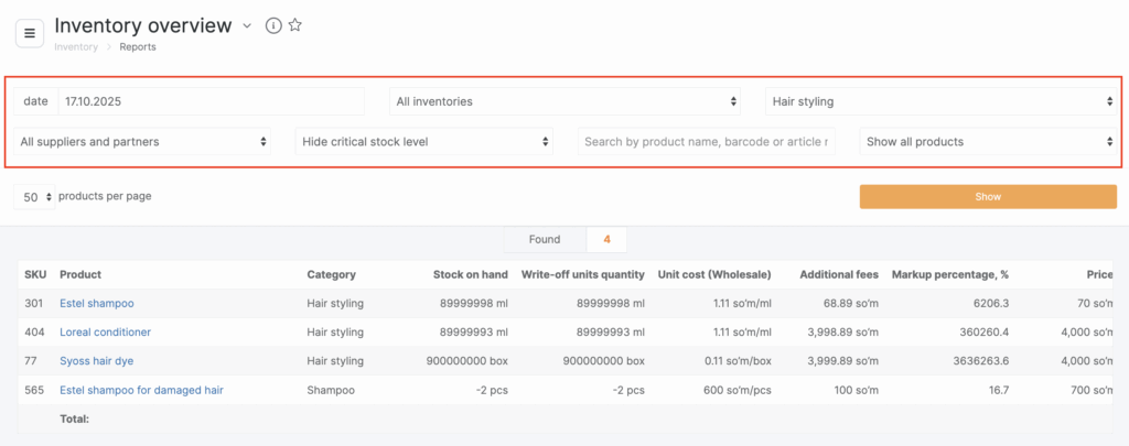 To generate an inventory balance report, navigate to the Inventory > Analytical Reports > Inventory Balance section. Next, filter the list according to the items you need, and then click on the “Show” button to generate the report.