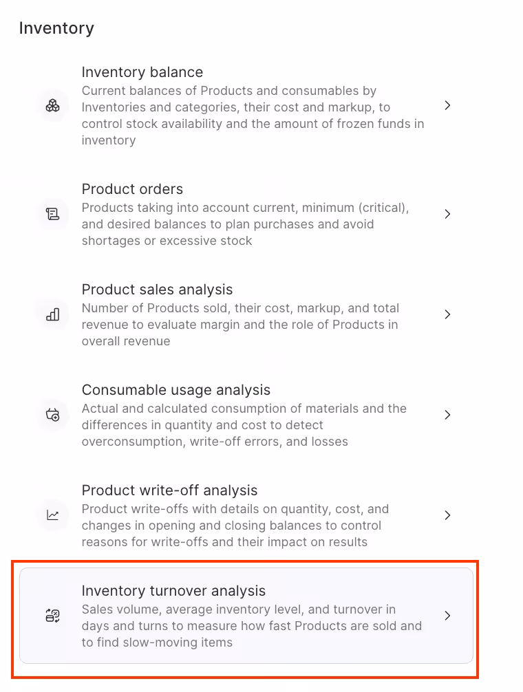 Turnover report can be viewed in the Analytical Reports > Inventory > Inventory turnover analysis section.