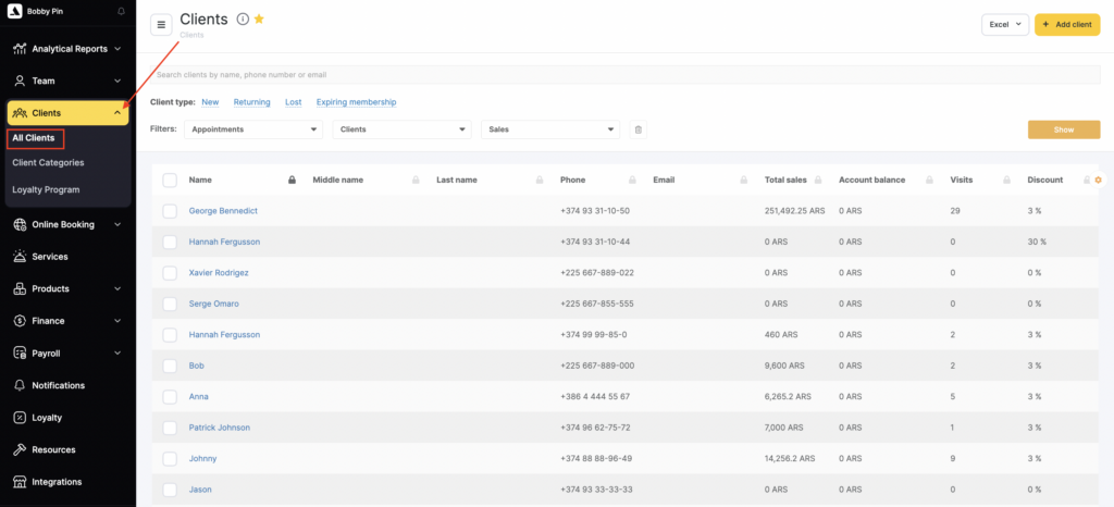 In the Clients > All Clients section, you can access information about all the clients who have ever visited your business. This list provides key information such as their names, contact details, total amount spent, discounts availed, number of visits made, and the dates of their first and last visit.