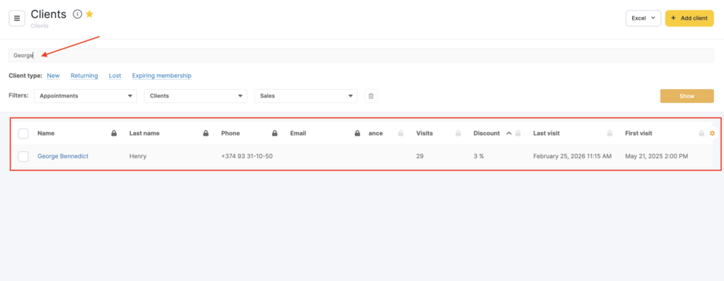 You can add clients to the Database not only by making appointments in the Appointment Calendar. In the All Clients section you can manually add clients. To do that click the Add a client button (read about creating a client’s card in detail here). You can also upload a list of clients using the Excel actions button (read about this in more detail here).