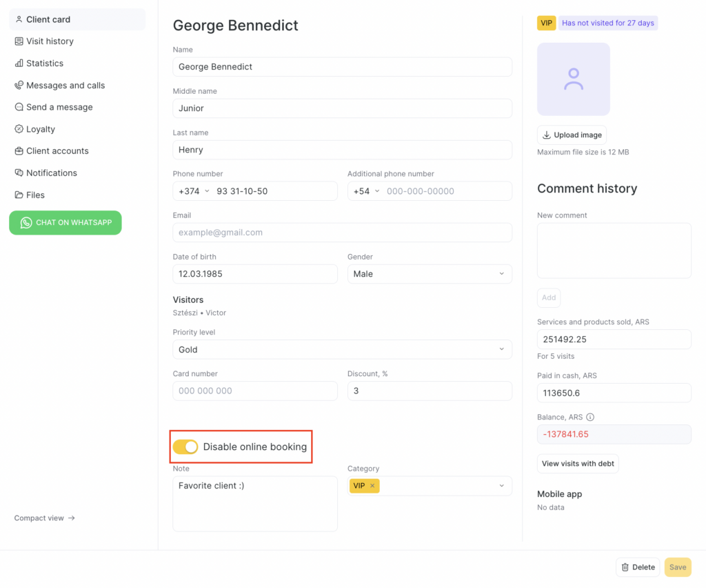 To add a client to the blacklist in the online booking system, go to Clients > All Clients, select the desired client, and check the box “Disable online booking.”