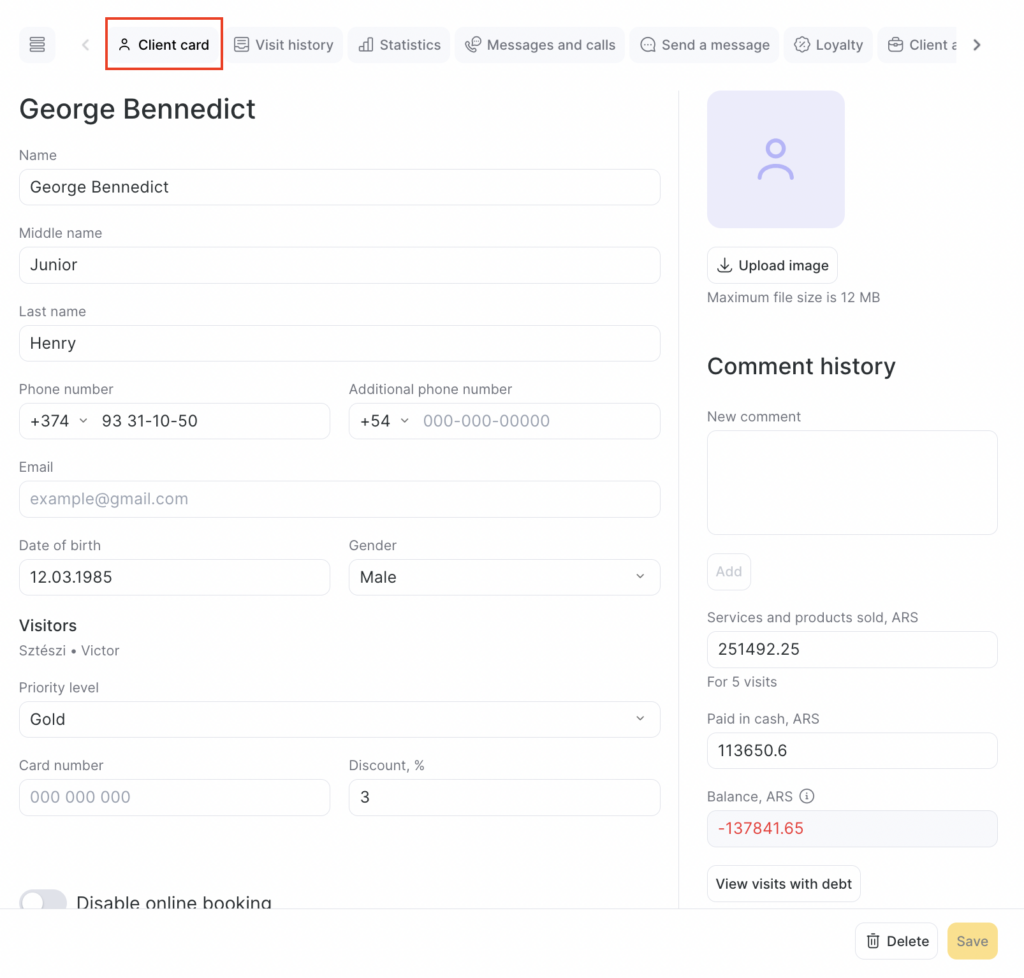 In the client’s card, you can access sections that contain all the information you have on the client, such as personal details, booking history, appointment details and more.