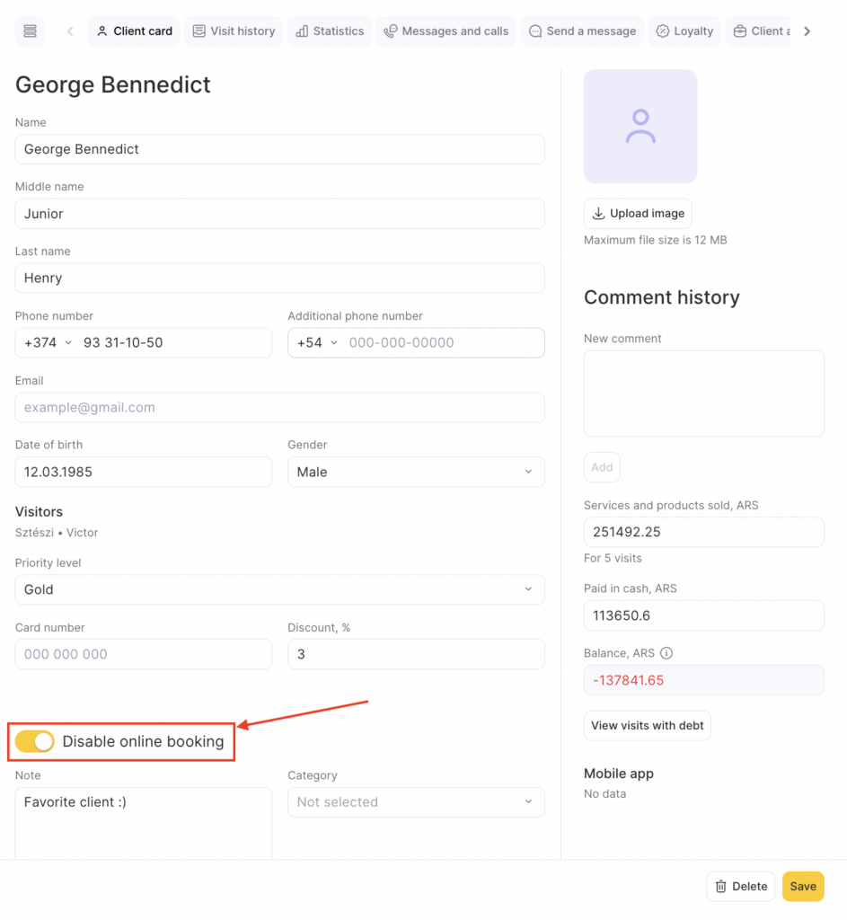 To add a client to the blacklist in the online booking system, go to Clients > All Clients, select the desired client, and check the box “Disable online booking.”
