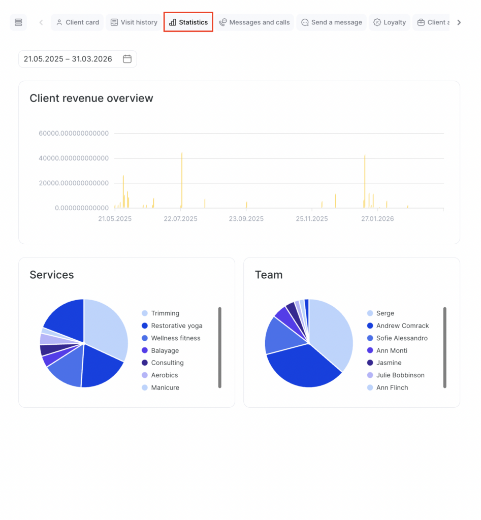This section displays all appointments made by the client, including the staff member who provided the service, the service itself, products purchased during the appointment, discounts applied, payments made, comments on the appointments, and locations visited by the client.