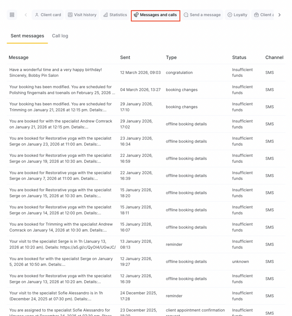 This section displays a list of all messages that have been sent to the client across all channels, including the type of message, its status, the date and time it was sent, and the content of the message.