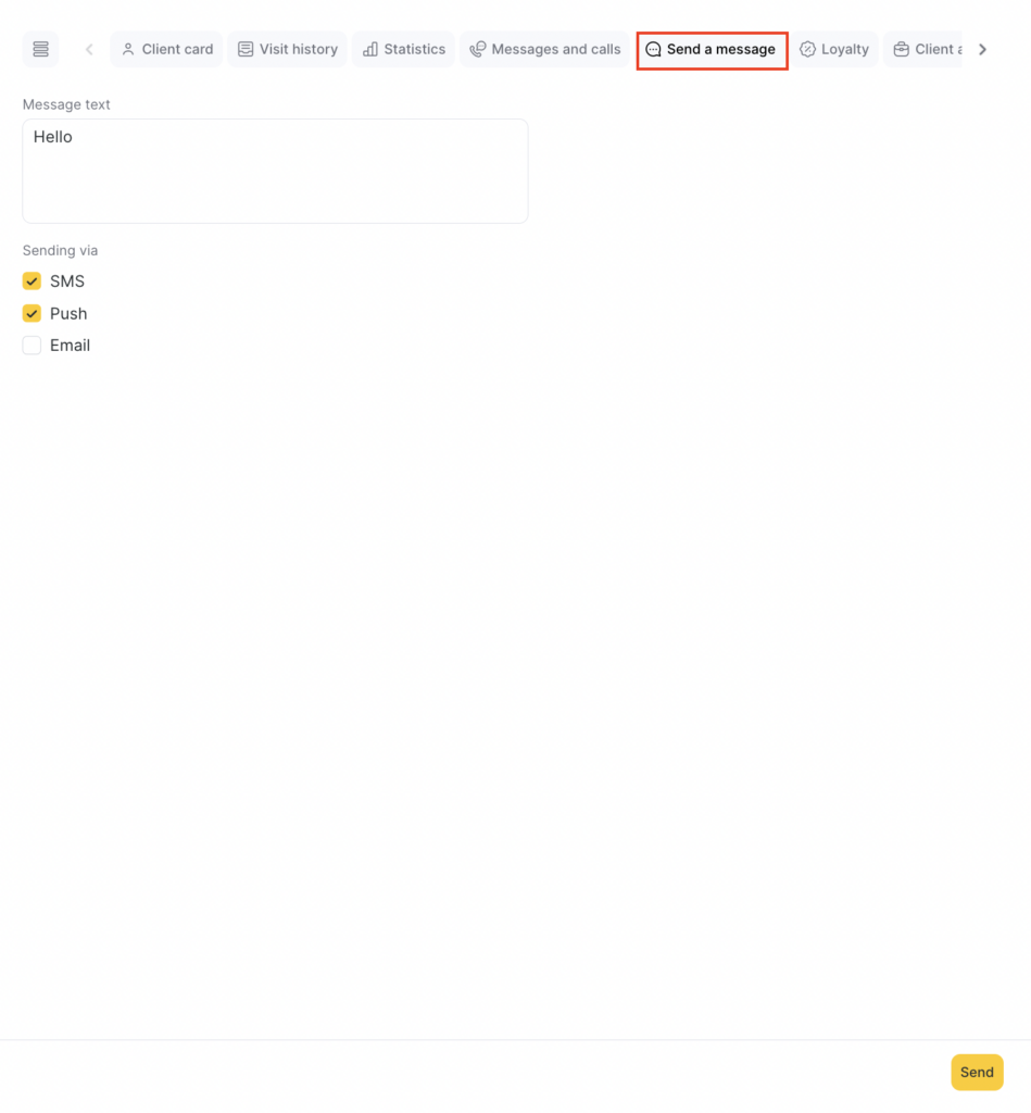 In this section, you can send a personalized message to your client using three different channels: SMS, Push message, or Email.