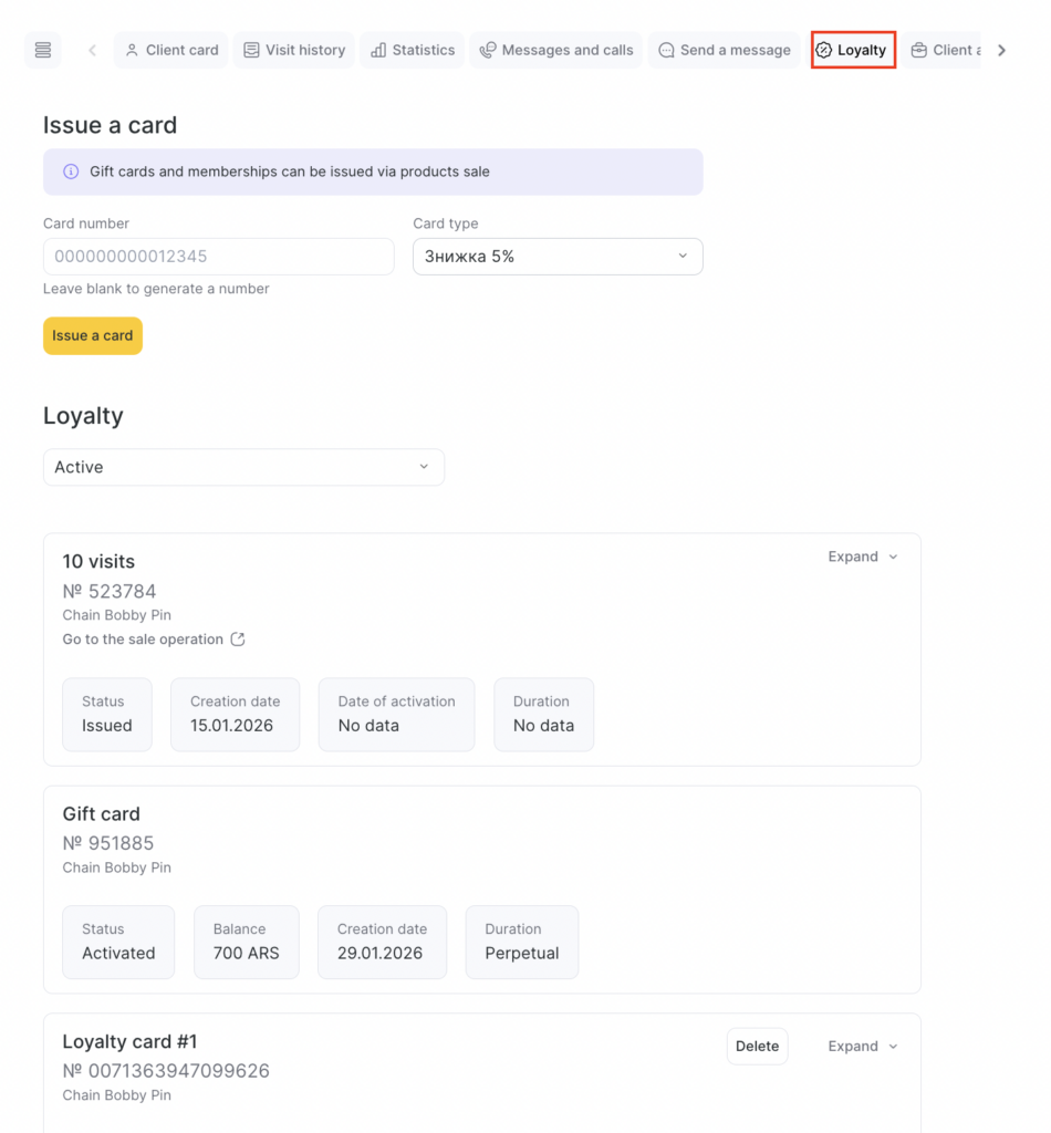 Here you will also see all gift cards and memberships, as well as loyalty cards, that were ever issued to this client and information on them: