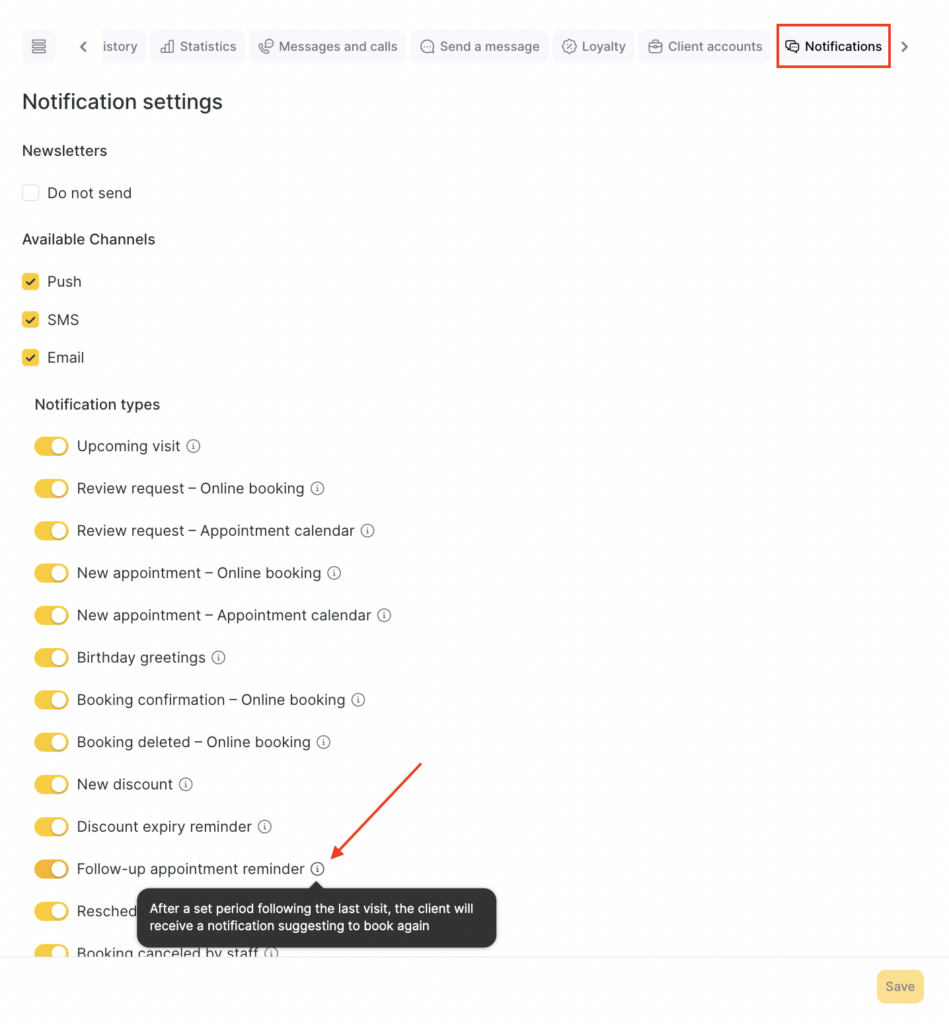 You can configure certain types of notifications to be sent to a client in the client’s card or switch off specific notifications.