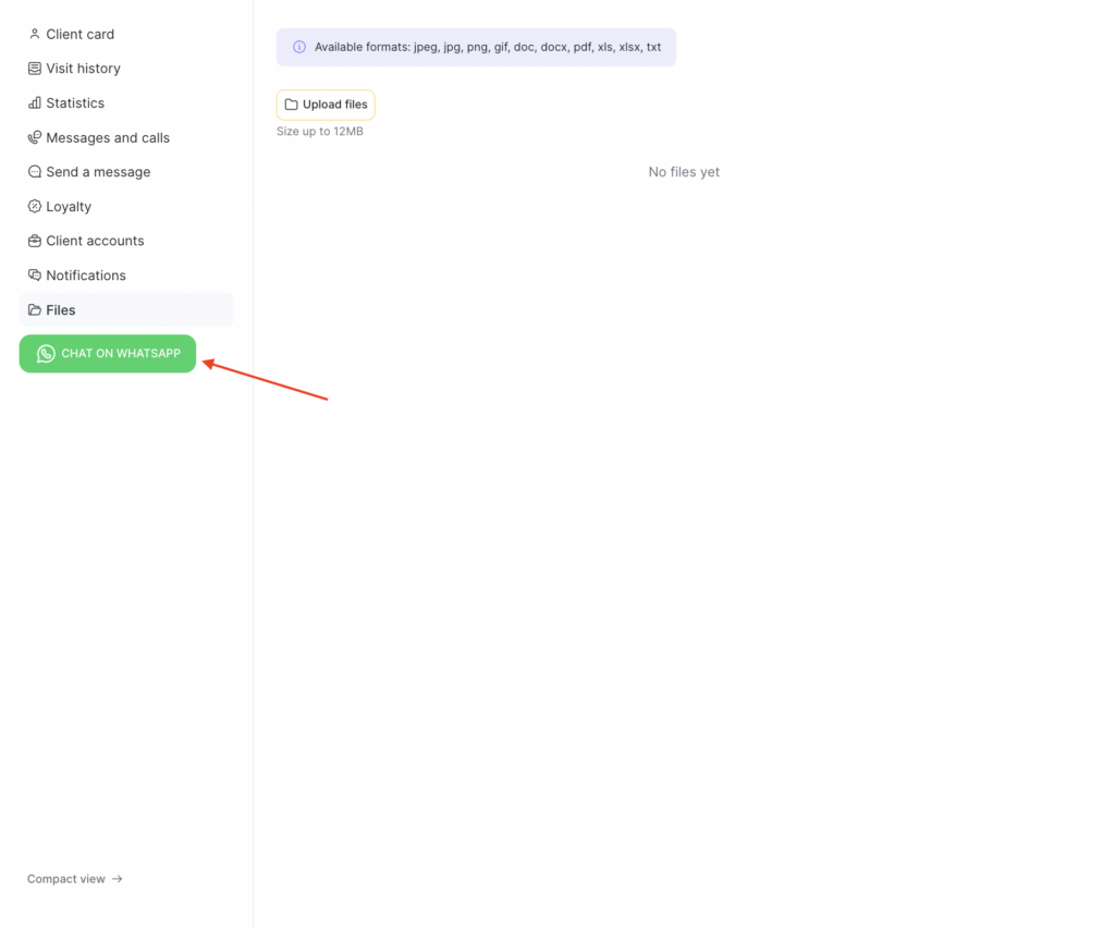 You can also quickly access the chat on WhatsApp from the client’s profile by clicking the green “CHAT ON WHATSAPP” button. This will open WhatsApp Web, allowing you to immediately message the client.