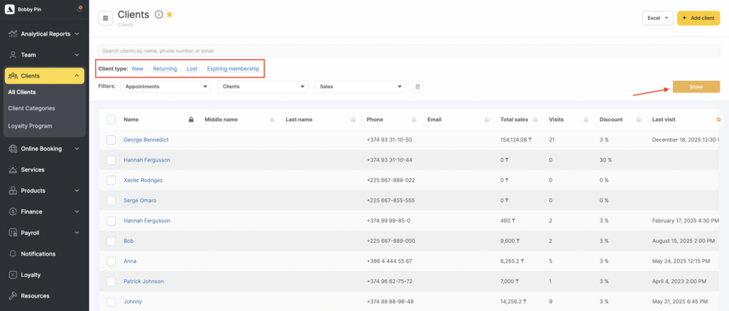 - Cost of provided services: This filter will help you find clients who spend more than the average amount during their visits.