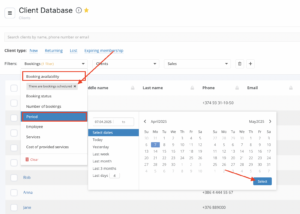 - Period: This filter will help you find clients who have made or not made a booking during a specific time period.