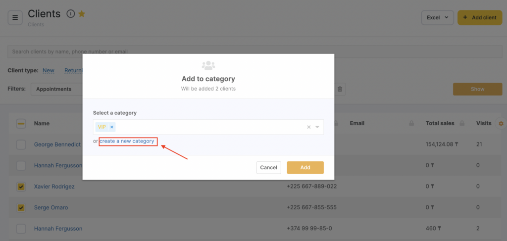 - Click the Bulk actions button and select Add to category if you want to add all clients to a category;