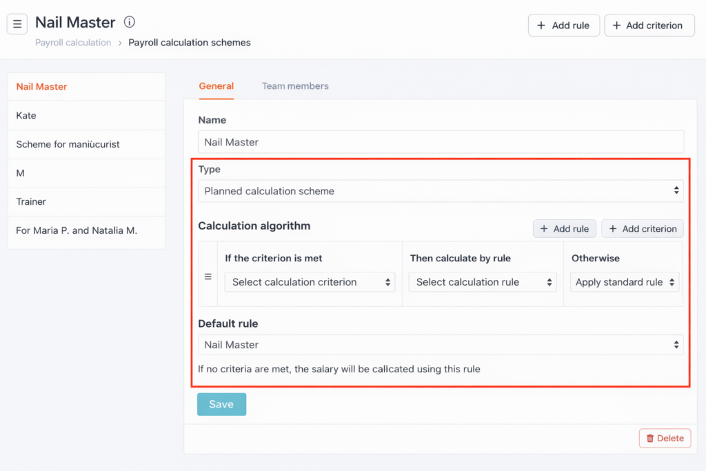 When configuring the algorithm, you set the relationship between criteria and rules. If the specified criterion is met, payroll is calculated using the specified rule. If the criterion is not met, either the Standard rule is applied (selected in the same section after choosing the scheme type) or the next criterion is checked. This way, you can set up multiple criteria and rules.