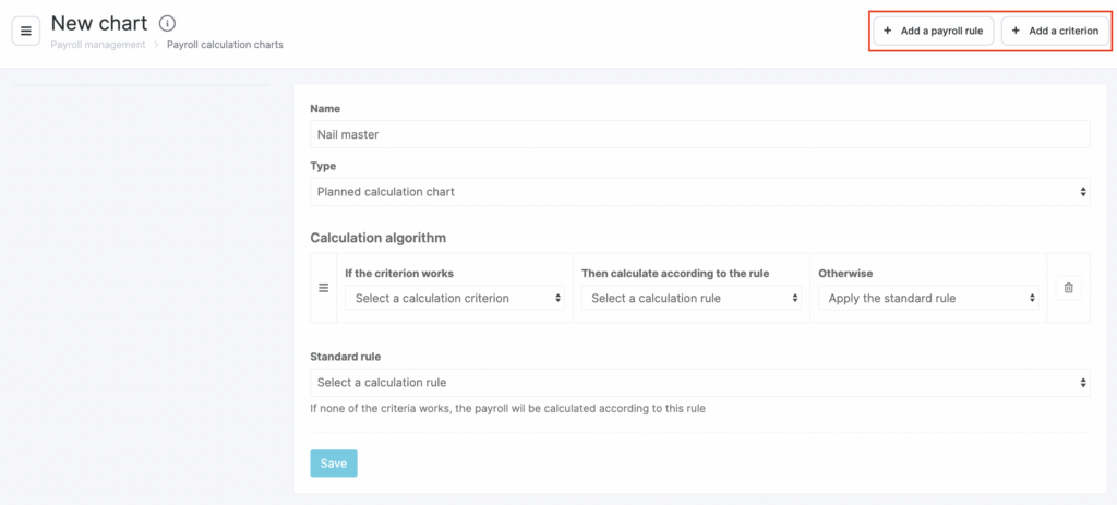When creating a calculation scheme, you can create a new rule and/or a new criterion. To do this, click Add a payroll rule and Add criterion.