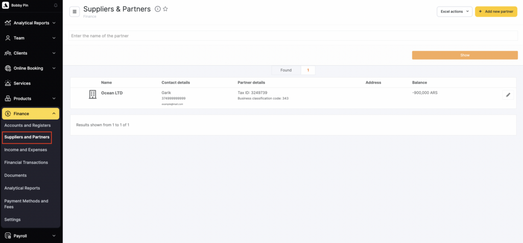 Altegio enables you to keep track of financial transactions with your company’s Suppliers and Partners, which may include private individuals or legal entities that your company has financial relationships with.