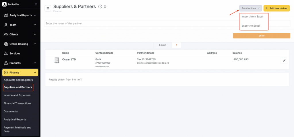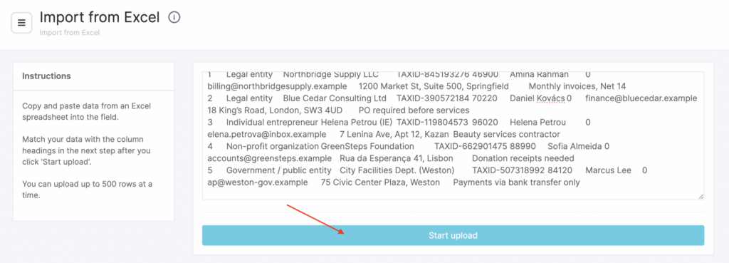- In the new window that opens, match the data to the table headers: Name, TIN, KPP, Contact person, Phone, Email, Address, and Comment.