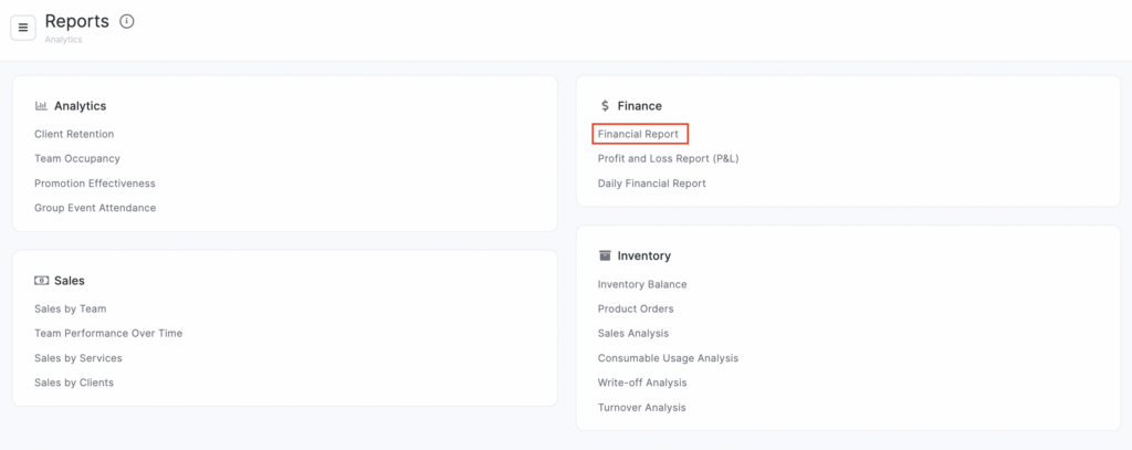 To access the financial report, navigate to the Finance – Analytical Reports – Financial Report (or Analytics – Analytical reports – Finance) section.