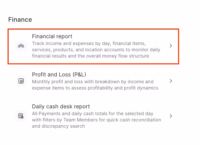The Financial report consolidates data on all income and expenses. By default, the report displays the last week’s data, but you can manually adjust the period to view information for a different time period.