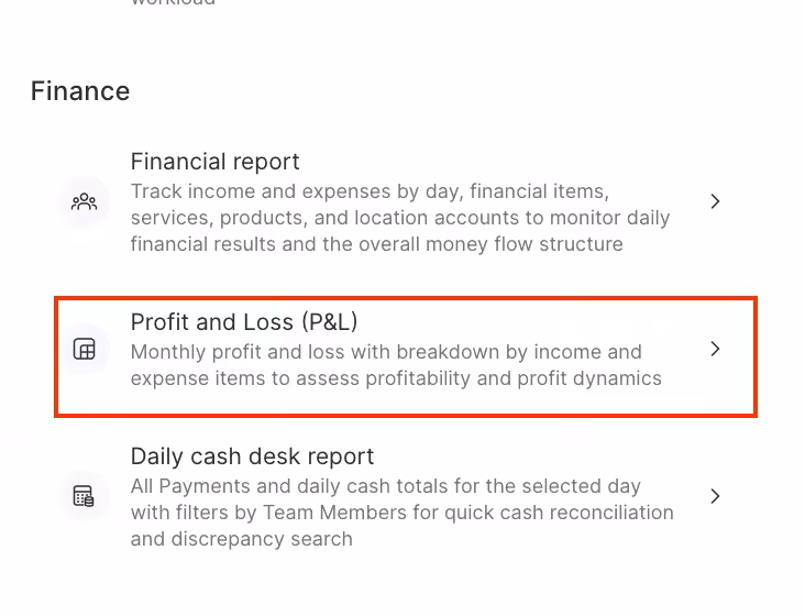 To start working with the report go to the Analytical Reports > All reports > Finance > Profit & Loss Report section.