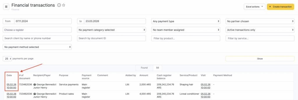 - Go to the Finance > Accounts and Registers and Finance > Financial Transactions sections. To create a new payment transaction click on the New transaction button.