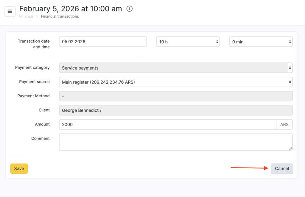 To delete a financial transaction, go to Finance > Financial transactions, open the required transaction by clicking its transaction date, then click Cancel. Confirm the deletion in the pop-up window.