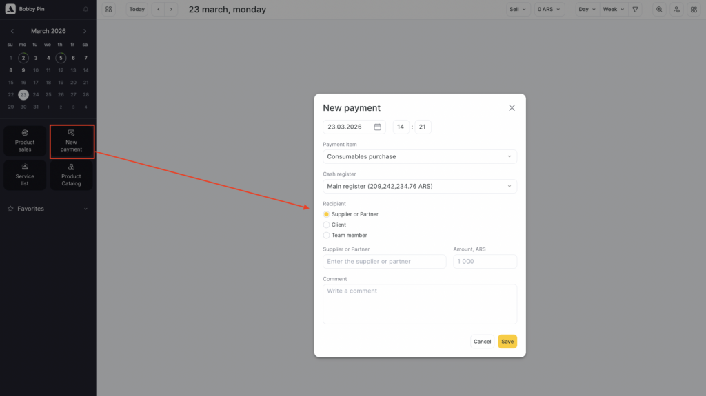 Under calendar click the New payment button.