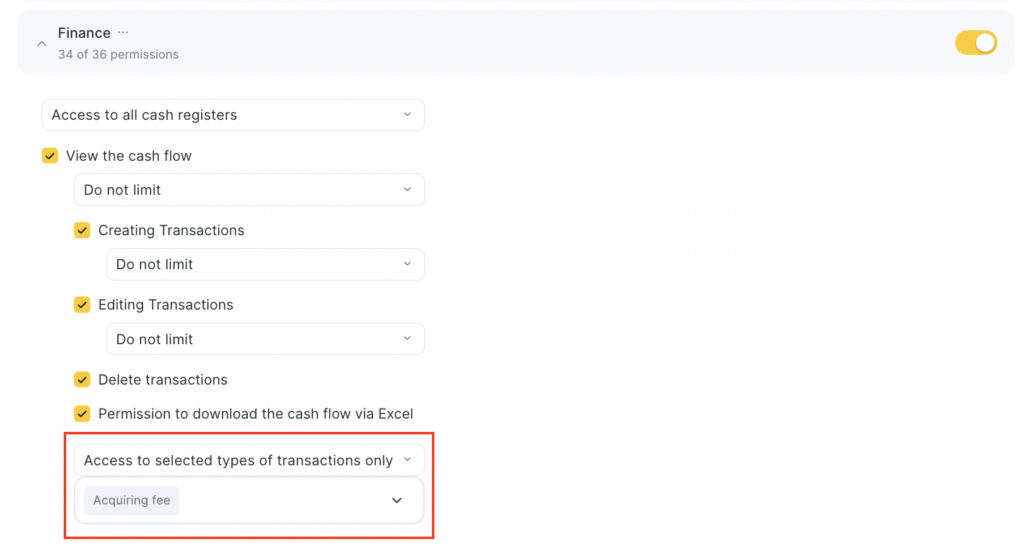 To view the acquiring fee write-off transaction, configure the user’s access rights to transaction types in the Finance section. Grant the employee access to all transaction types, or, if only to selected ones, check Acquiring fee.