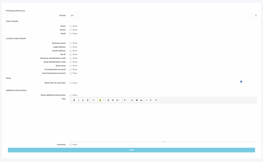 You can adjust the size of a non–fiscal receipt (A4, terminal printer 80 mm or 58 mm), as well as display the following information: