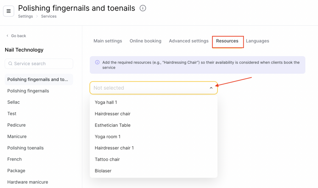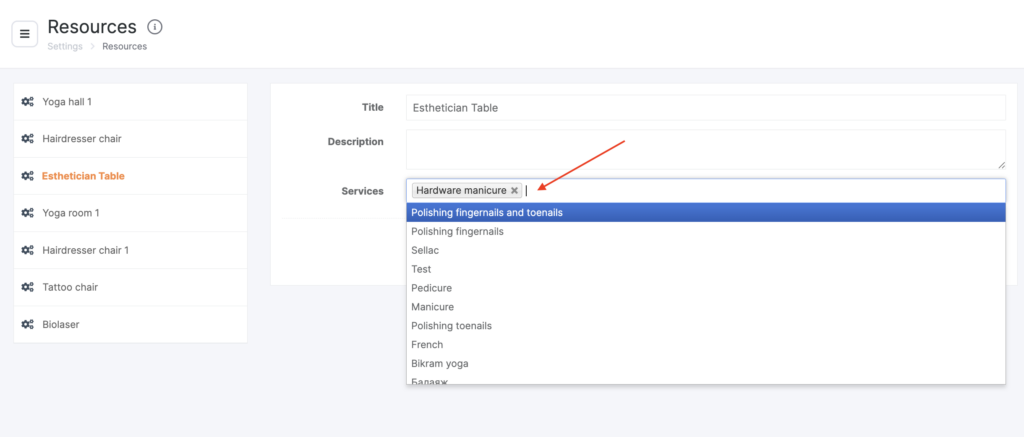You can link multiple resources to a service — to do this, check the boxes next to the required resources in the drop-down list.