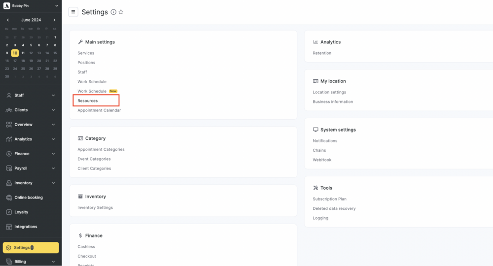 When a client independently books online for a service that has resources linked to it, one available instance of each linked resource is booked by default.