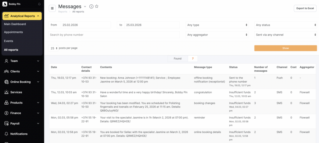You can also view the overall message history for all clients and filter it as needed. To do this, go to Analytical Reports > Messages (detailed instructions are provided in the article).