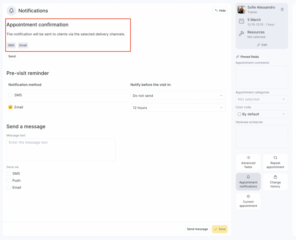 Even if sending this type of notification is disabled, you can still send an SMS with the appointment details individually.