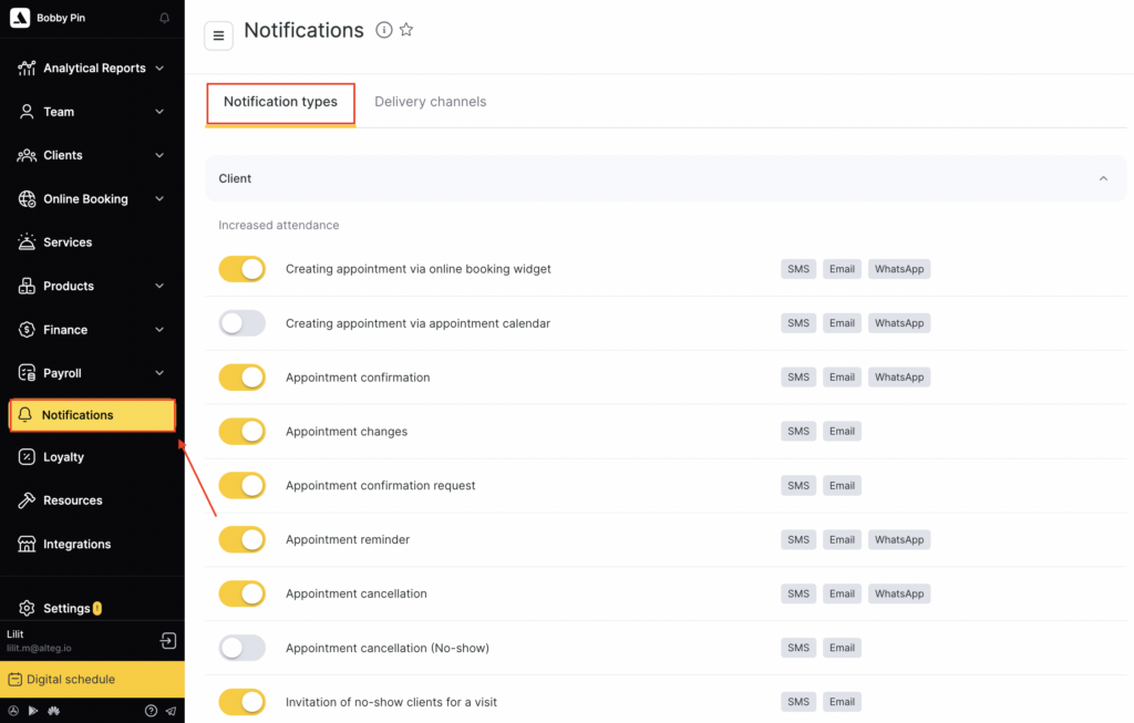 To enable the notification, return to the Notification types tab and switch the toggle to the active state. To disable it, switch the toggle off.