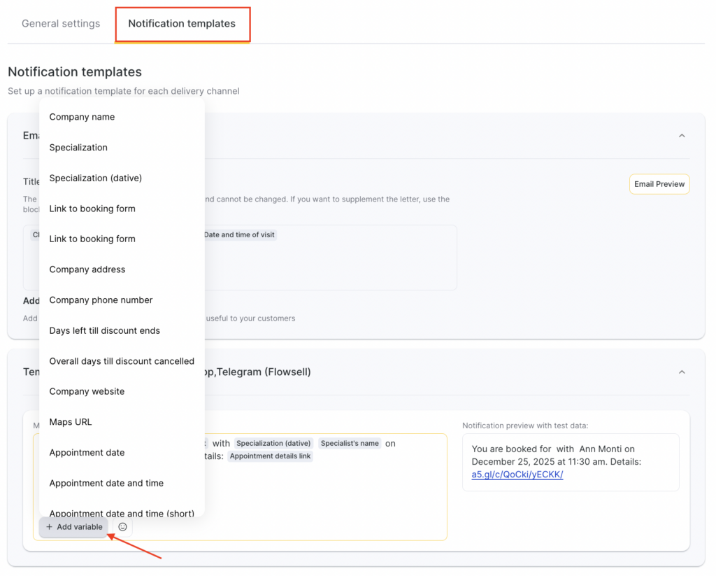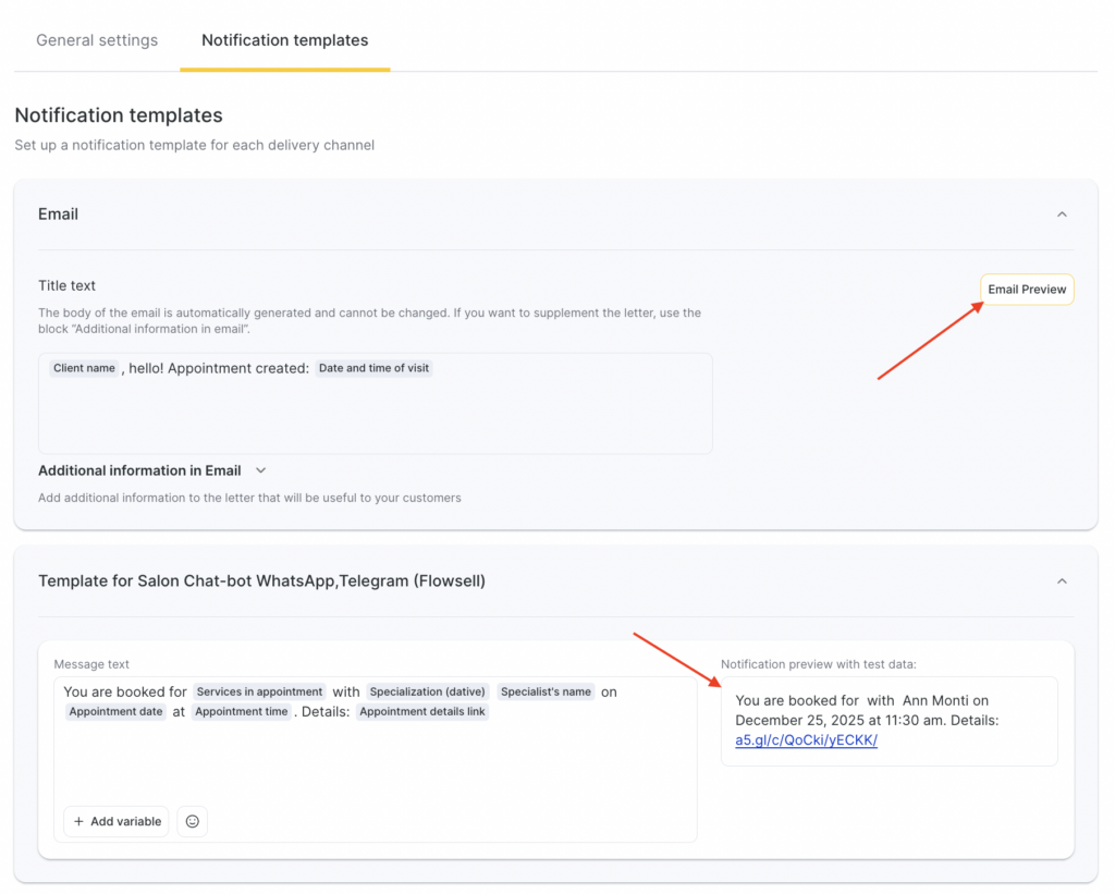 For all notification templates, preview is available — how the message will look when sent to a client, team member, or receptionist, including variables.