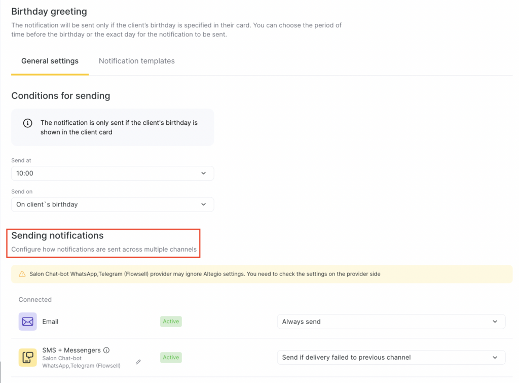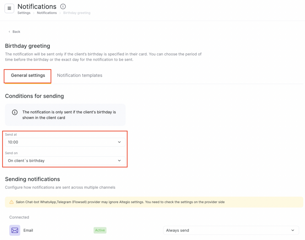 - In the Client > Retention section, select Birthday greeting by clicking the notification name or the pencil icon.