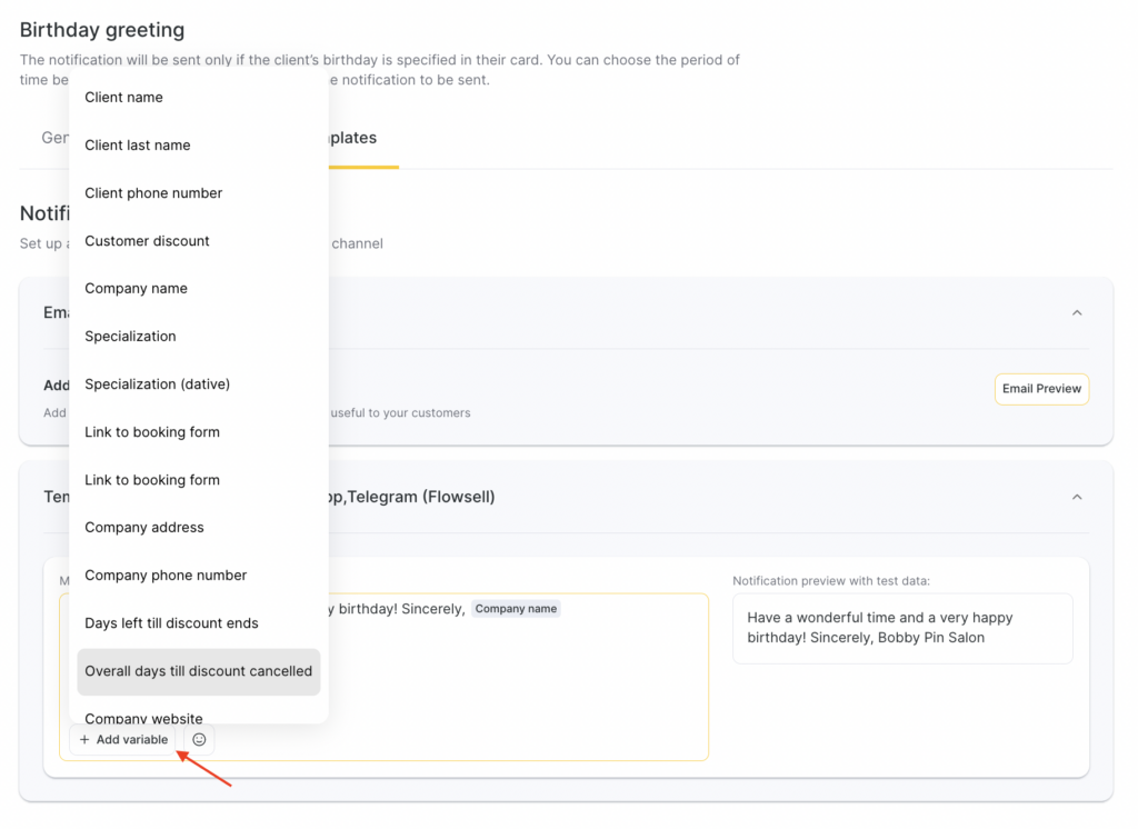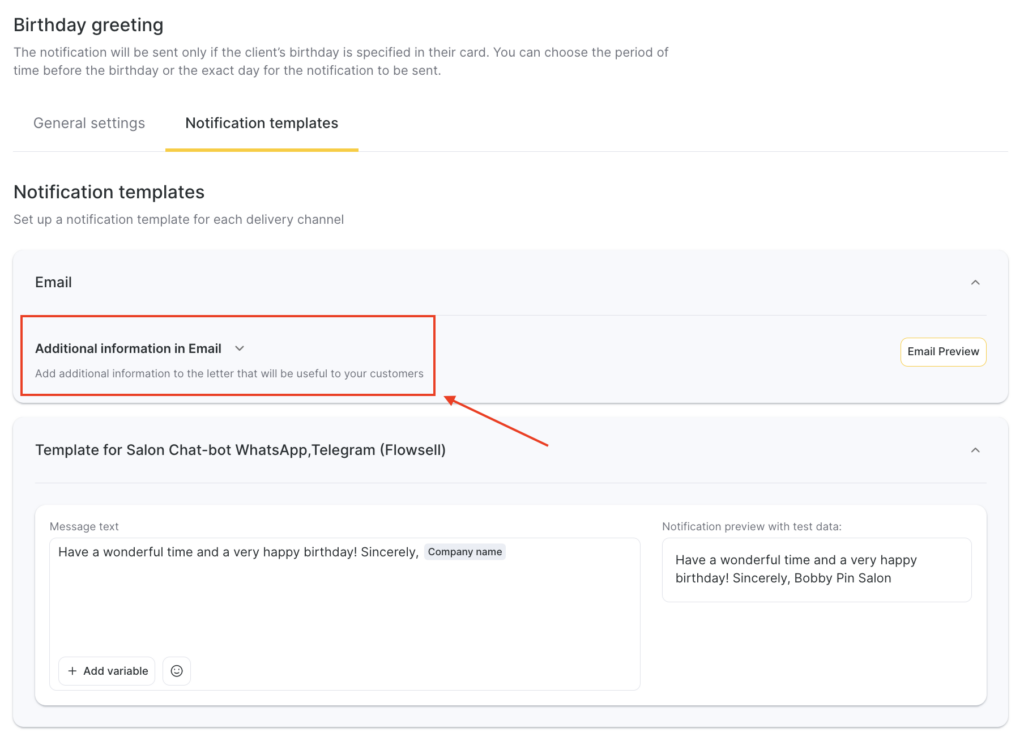 - For all notification templates, preview is available — how the message will look when sent to a client, employee, or administrator, taking variables into account.