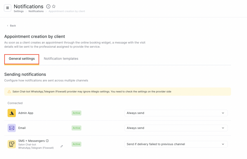 - On the General settings tab, configure how notifications will be sent via multiple channels. For more details about multi-channel notification scenarios, see the article. Available channels: