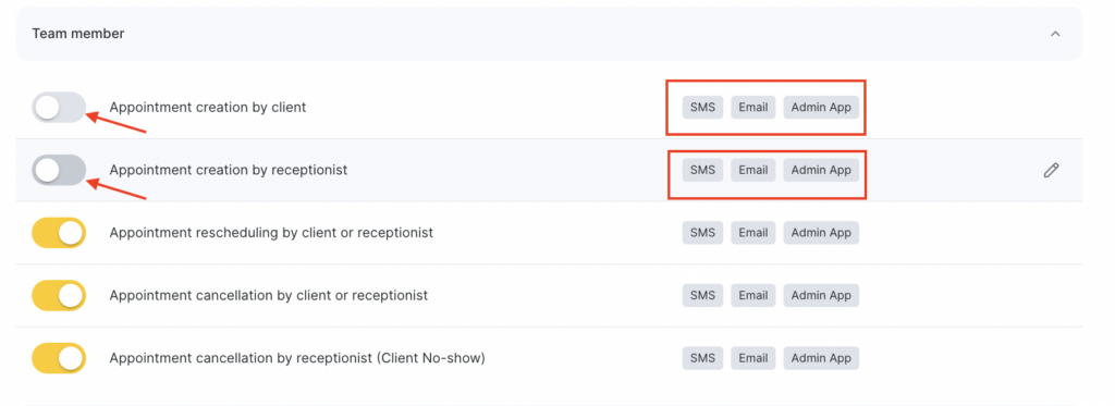 - In the Team Member section, select Appointment creation by client / Appointment creation by receptionist by clicking the notification name or the pencil icon.