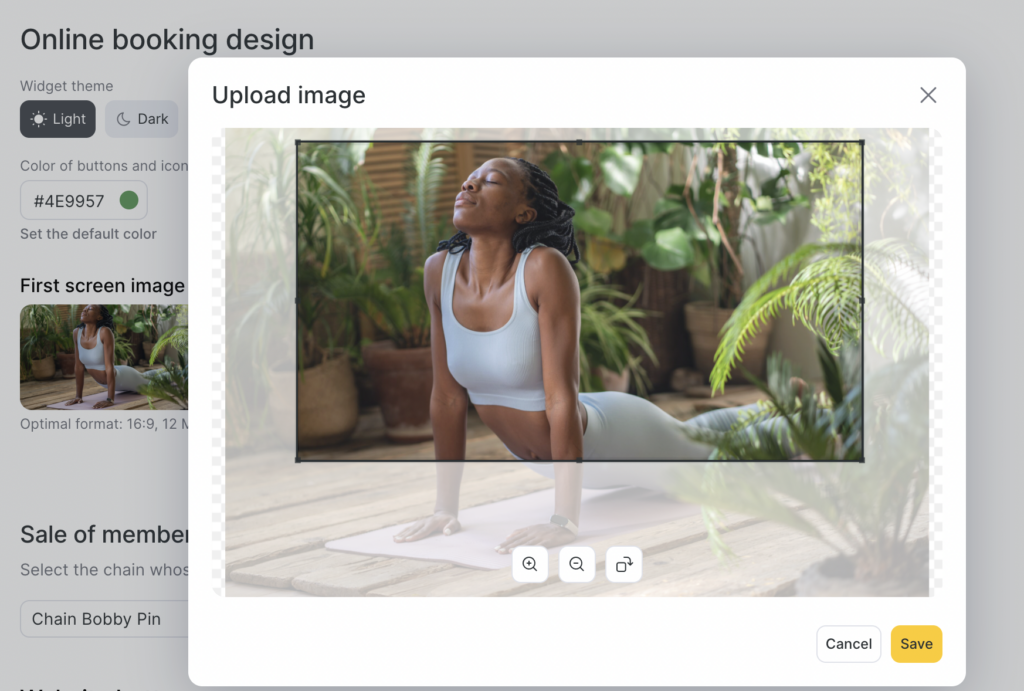 - To upload an image for the first screen, click Upload image. In the window that opens, find the Online booking design section.