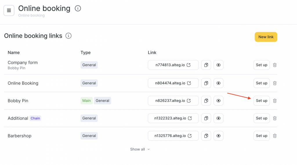 - To locate the Meta (Facebook) Pixel field in Altegio, navigate Online booking, choose the preferred widget and click Set up.