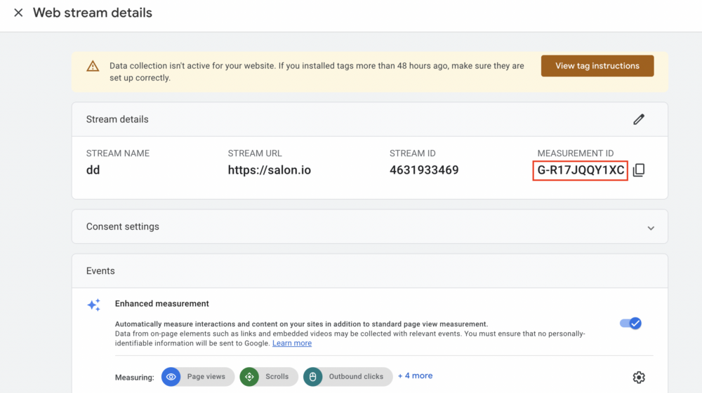 5. Copy the measurement ID from the Web stream details window. The identifier has the format G-R17JQQY1XC.