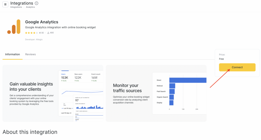 In Altegio, go to the Integrations > Analytics section and select the “Google Analytics” application. On the page that opens, click the “Connect” button.