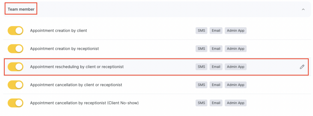 - In the Team member section, select Appointment rescheduling by client or receptionist by clicking the notification name or the pencil icon.