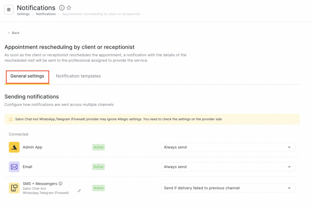 - On the General settings tab, configure how notifications will be sent via multiple channels. For more details about multi-channel notification scenarios, see the article. Available channels: