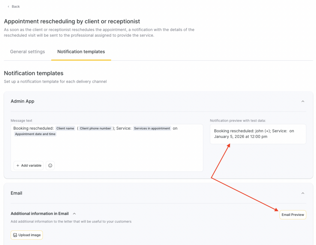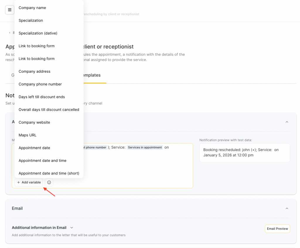 For all notification templates, preview is available — how the message will look when sent to a client, team member, or receptionist, taking variables into account.