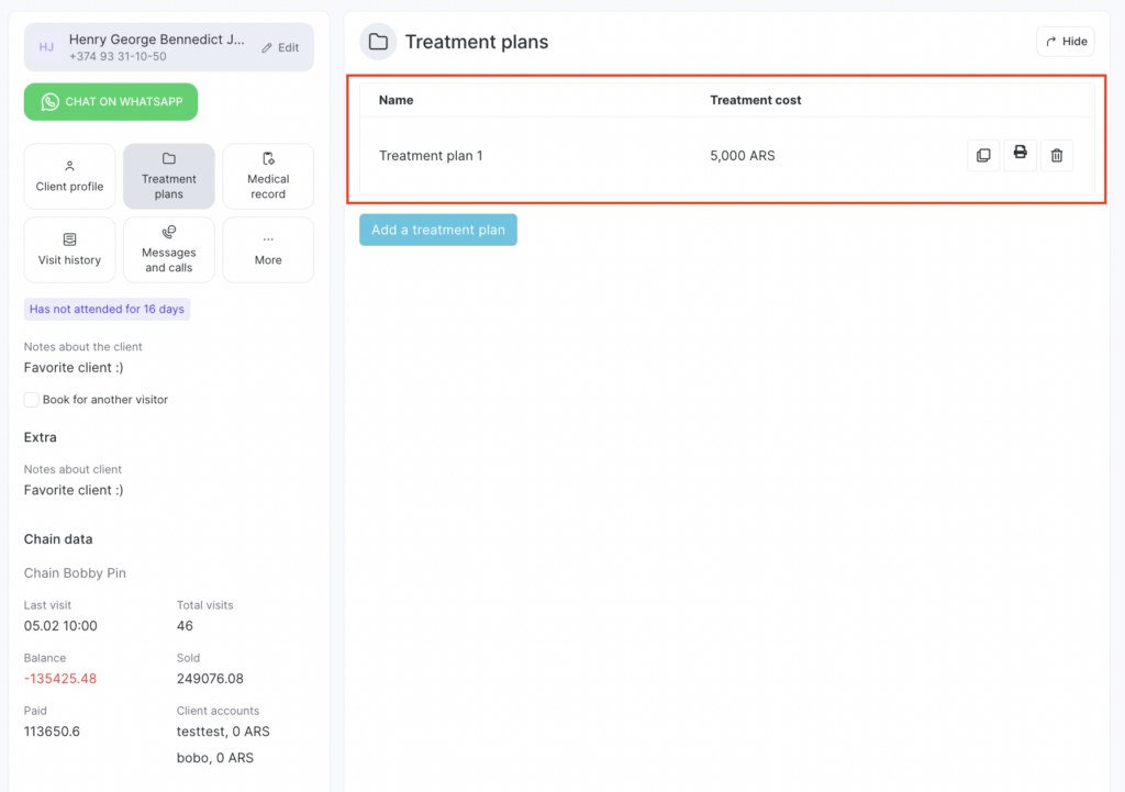 You can copy, print, or delete a saved treatment plan. In the same section, you can view all treatment plans created for the patient.