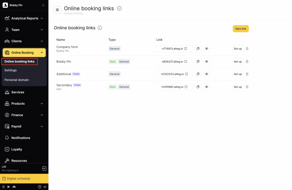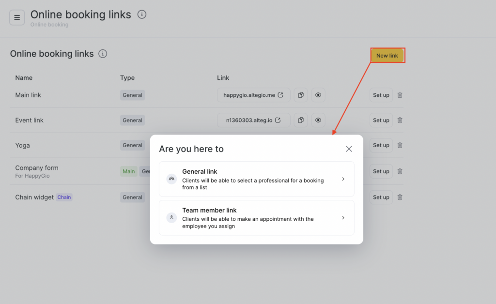 - If you want to create a separate link for one of your employees—or if you run a personal beauty studio with a single specialist—click Team member link.